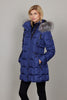 Down jacket with silver fox fur on detatchable hood. The jacket has pocket details with black/orange ribbons, zipper and snap closure and a slit with zipper at the back. The jacket is lined and has an