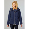 The jacket features a front zipper closure and refined details in off-white imitation leather, adding a subtle touch of luxury. Navy and white piping accentuates the silhouette, enhancing the nautical vibe. Adjustable drawstrings at the hood and hem allow for a customized fit, while the fixed hood provides reliable coverage against the elements.
